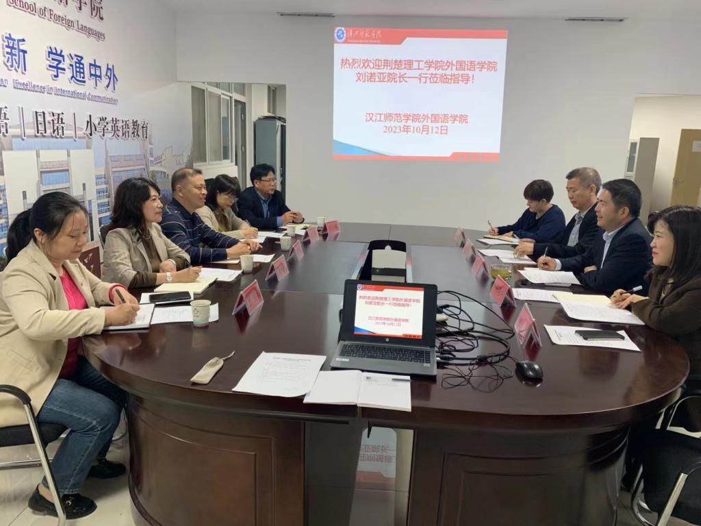 祝经理介绍了汉师球盟会本科专业、团队力量、产学研合作教育、第一、第二课堂延展的基本情况。冯晓华副经理分享了汉师球盟会在专业建设、人才培养方案制定、课程建设、教师教育类课程教学等工作中的亮点和特色。齐雁飞副经理就大学英语教学改革及考研辅导情况作了详细介绍。随后,双方就一些专业办学的难点痛点进行了深入讨论和交流。