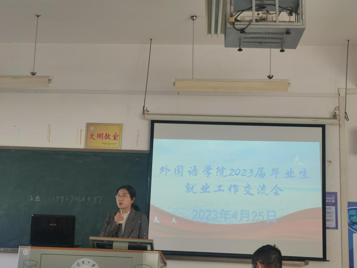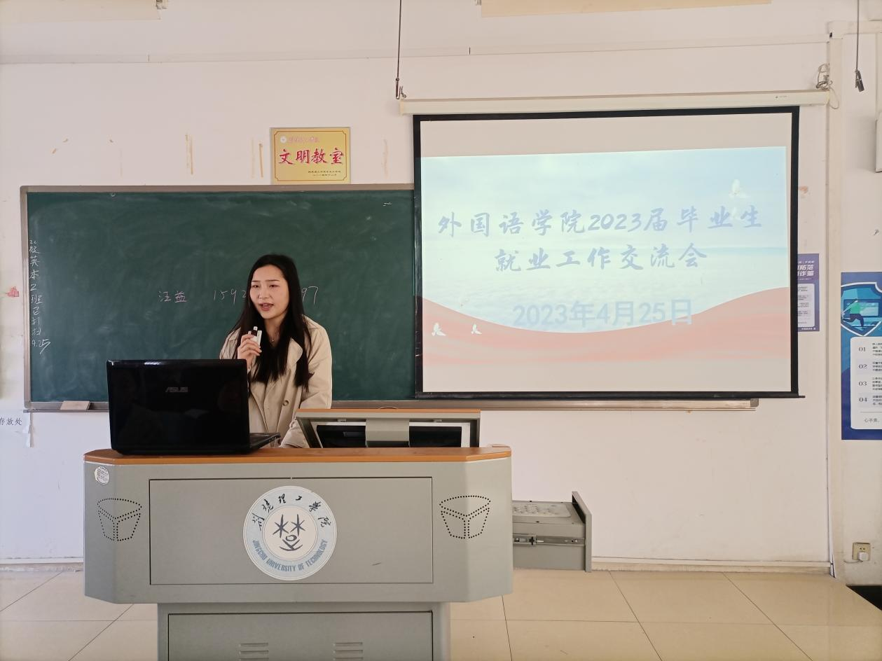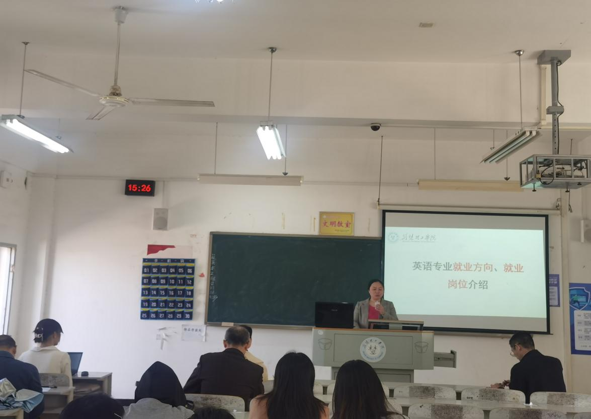 英语专业负责人罗倩黄音频和商务英语专业负责人分别就专业就业方向和就业岗位选择进行分析和指导。就业指导教师代表、优秀员工代表及2023届毕业生代表分别结合工作实际、求职经历一一进行发言。
