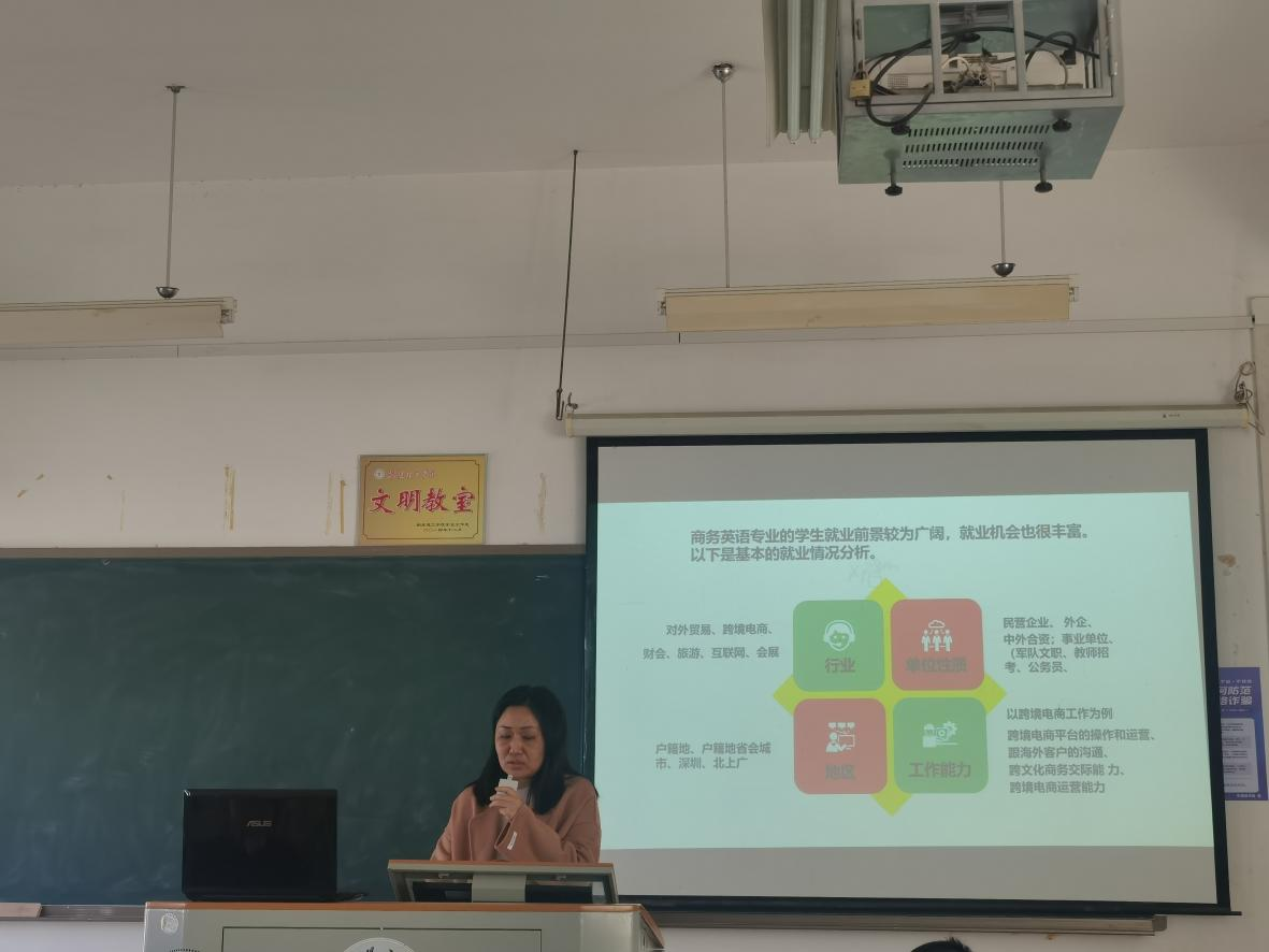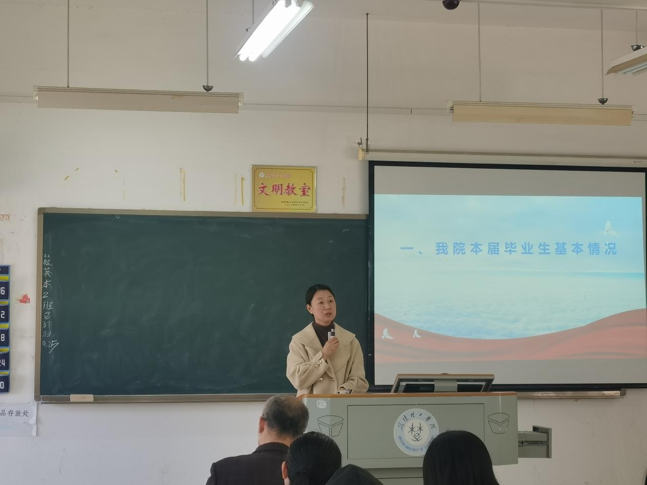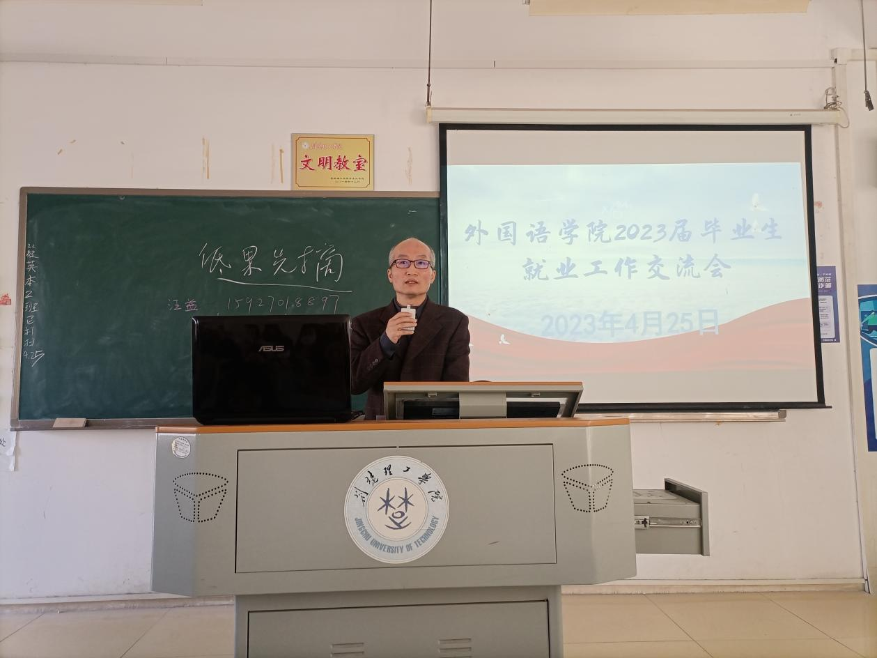英语专业负责人罗倩黄音频和商务英语专业负责人分别就专业就业方向和就业岗位选择进行分析和指导。就业指导教师代表、优秀员工代表及2023届毕业生代表分别结合工作实际、求职经历一一进行发言。