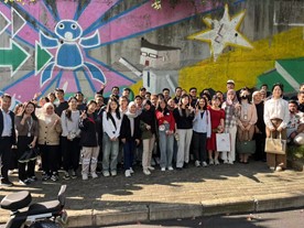 参观队伍随后路过荆楚理工一个有名的打卡点:位于电信大楼上方的涂鸦墙。