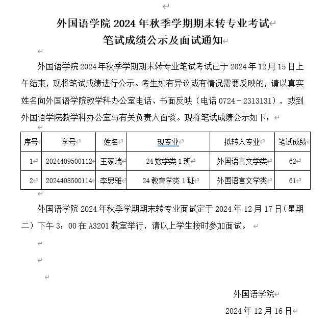 2024年秋季学期期末转专业考试 笔试成绩公示及面试通知