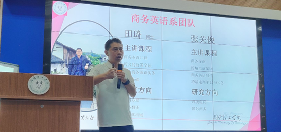 商务英语系主任张关俊先介绍了商务英语系全体老师、他们的研究方向以及他们所带课程,让员工对自己的专业老师有了更深的了解和印象;接着以吕盼、朱晓菲、王陈、朱雅伶、周雨田、伍佩敬、喻洁心、黄慧林和陈厚龙等九位往届毕业生的职业发展轨迹和现状展示了商务英语专业的职业发展特征:市场需求广泛、待遇优厚、晋升空间广阔和职业路径多元;希望员工能在低年级时博览群书、开拓视野、勇于尝试,高年级时聚焦目标、积累经验、调整心理状态,努力培养英语语言、商务、数据分析、国际视野、跨文化和终生学习等方面的能力。