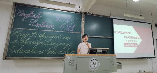 6月21日上午,A2205 教室座无虚席,2022 级英语专业及 2024 级英语(专升本)百余名员工齐聚一堂,共同聆听湖北 “楚天名师”、全国十佳初中外语教师、荆门市外语公司英语教研组长杨新征老师带来的“鼎力架起语言之桥,同心共育教育新苗”主题讲座。讲座中,杨老师结合丰富的一线教学经验,深入解析教育实习要点,现场互动频频,不时响起热烈掌声。此次活动由英语专业负责人罗倩主持,英语系主任何琳玲、毕业年级辅导员及学业导师代表到场一同聆听讲座。公司党委副书记王玥出席。