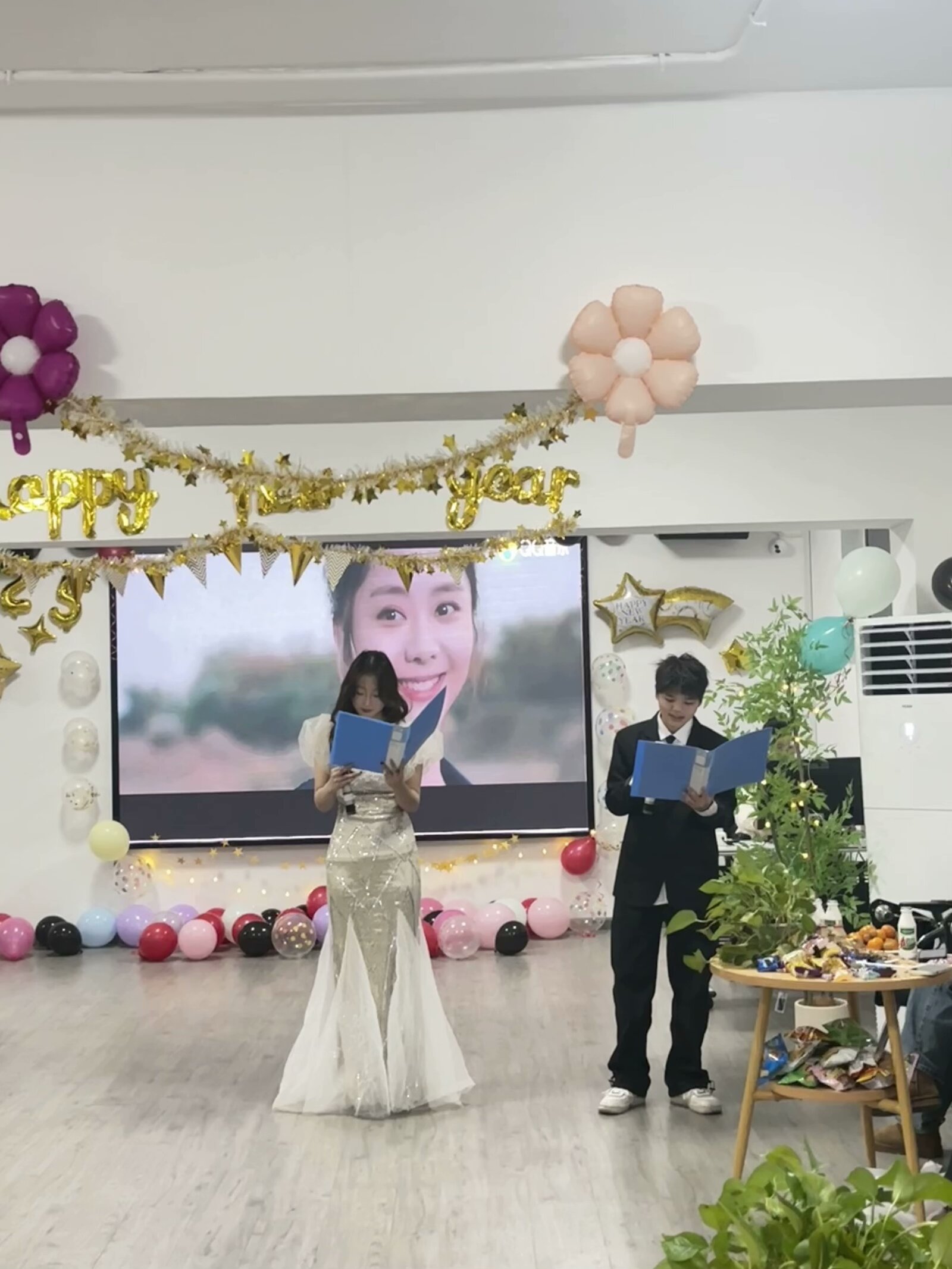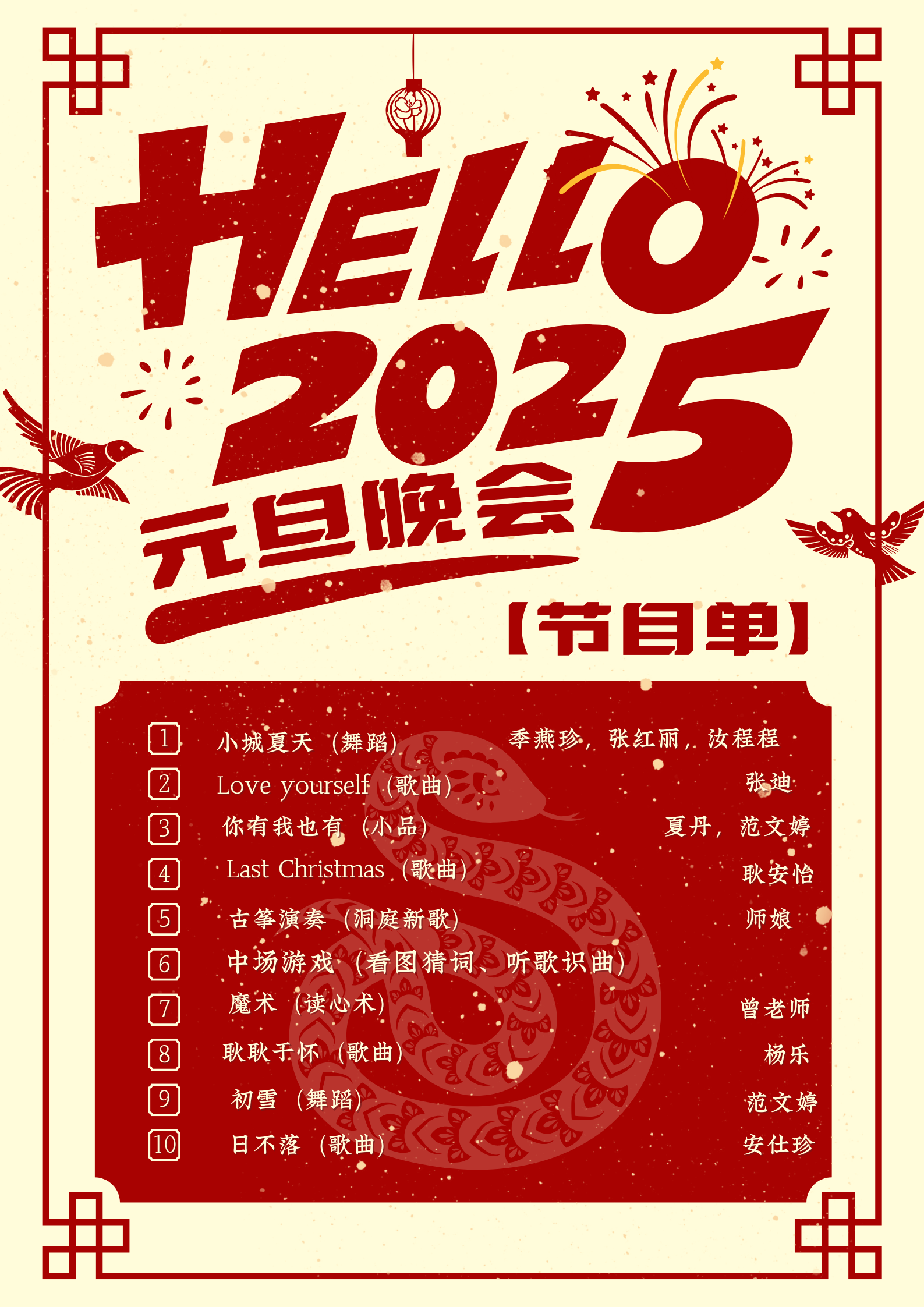 瑞龙辞岁,金蛇报喜,12月30日晚,24级专升本二班在文园驿站成功举办2025年元旦晚会,共同欢庆新年的到来。公司党总支副书记王玥、学工办主任刘佐楚、辅导员曾琪和易超文出席本次晚会。